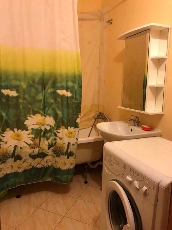 Все для жилья есть: во всю стену большой зеркальный шкаф, кровать, компьютерный стол, небольшая стенка, кухонный гарнитур. Из техники имеется холодильник, плита, микроволновка, стиральная машинка.